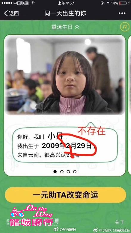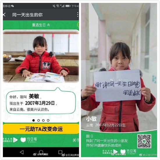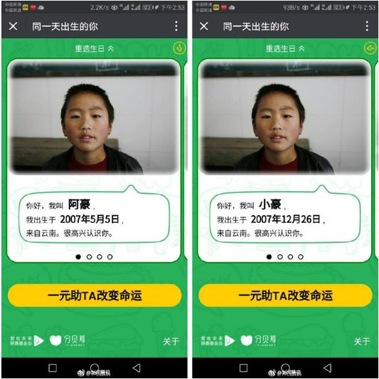“分贝筹”,为何要帮助的孩子照片相同,生日却不一样?今天(12月23日),爱心活动“分贝筹”在网上刷屏,宣称“一元助TA改变命运”,可寻找和自己生日相同的贫困儿童,为其捐赠一元钱。然而,细心的网友发现,有女孩头像相同,但她们的生日却不是同一天,接下来又有人发现了类似情况。甚至还出现了有孩子出生在2009年2月29日……不少网友在发现问题后,认为该活动的可信度值得怀疑。 北京青年报消息,昨天,一个名为“分贝筹”的爱心活动刷爆了微信朋友圈。活动页面宣传“一元助TA改变命运”,用户输入自己的生日,可寻找和自己生日相同的贫困学生,为其捐赠一元钱。 然而不少网友贴出的照片显示,同一个受助的贫困学生,却在不同的生日界面中出现,而且名字也不同,甚至信息还显示有贫困学生出生在2009年2月29日。 这些问题引发了不少网友的质疑。昨天晚上,“分贝筹”发布通报回应称,活动在测试阶段被工作人员发到朋友圈后传播开来,出现了信息错误和界面不稳定的情况,就此向公众道歉。目前已紧急协调优化界面,避免系统再次出错。 受助孩子照片相同 姓名生日却不一样 “一元助TA改变命运”的“分贝筹”爱心活动昨天在微信朋友圈热传。 由于用户进入活动页面后,可以找到和自己同一天生日的贫困学生进行捐助,这个颇有创意的活动引发了不少人的关注。 然而,很快有网友“晒”出了这个活动的疑点:在5月5日出生的受助人显示为“阿豪,出生于2007年”,同一张照片也在12月26日的受助人一栏中出现,姓名变成了“小豪”。 随后网友陆续晒出了“学生照片相同,姓名出生日期不同”的多个例子。 3月29日出生的美敏和12月22日出生的小敏是同一个人;1月3日出生的阿碧,在11月24日一栏中变成了贵碧…… 更有网友发现,一个名叫小丹的姑娘“出生在一个并不存在”的日期:2009年2月29日。 受助人信息已修改 爱心活动遭受质疑 根据不完全统计,“一人分饰两角”的例子至少有6个。 不少网友认为该公益活动的可信度值得怀疑,更有人怀疑活动运营方是否有此类爱心活动的运营资质。 昨天下午,北京青年报记者查询发现,照片相同的阿豪和小豪,依然以不同的身份出现。 昨晚9点左右,北青报记者再次打开“分贝筹”的活动页面,5月5日出生的受助人已经从阿豪变成了婷婷,12月26日出生的受助人小豪则没有变化。 其他之前被网友指出的存疑信息已经被重新修改,3月29日出生的美敏,信息没有变化,与其照片完全相同的小敏被替换,图文信息变成了12月22日出生的婷婷。 根据活动页面的引导,记者成功为1月3日出生的阿碧捐款后,转账信息显示,捐款进入了深圳市爱佑未来慈善基金会账户。 活动运营方昨回应 受助学生信息真实 昨天晚上,针对来自公众的质疑,北京零分贝科技有限公司发布通报对外进行回应。 通报称,“分贝筹”是由北京零分贝科技有限公司和深圳市爱佑未来慈善基金会联合推出的微信公众号应用产品。 “分贝筹”上所有的受助学生都来自“国家建档立卡”贫困户家庭。平台上的受助学生资料,均由各地“驻村干部”和“结对干部”实地走访了解,拍摄并上传。所有在“分贝筹”上展示的孩子照片和信息,均已获得了孩子监护人的书面授权。 通报还称,在云南楚雄县政府和基层扶贫干部努力下,7位摄影师用近一个月的时间,深入乌蒙山区的大山之中,走访拍摄了366个不同生日出生的孩子。 同一孩子不同生日 系测试阶段被误转 对于出现“同一个孩子不同生日”及“2009年2月29日生日”出现的原因,分贝筹方面表示,原计划在12月25日在网上推广这个活动,但工作人员为了测试效果便转发到了朋友圈,“小范围的举动,没想到在12月22日晚上迅速发酵”。 “分贝筹”表示,因为内容还在测试阶段,出现了一些信息错误以及界面不稳定的情况,开发团队在得知消息后紧急协调优化H5,避免bug再次出现。 北青报记者了解到,截至昨天下午1点半,活动已经收到44万元捐款。既然活动处于测试阶段,那么,公众捐出的善款是否会出现问题? “分贝筹”称,所有善款均进入公募基金会深圳市爱佑未来慈善基金会账户,并由其统一直接发放给受助学生。善款发放后,由当地帮扶干部上传善款使用进展,如发放过程出现问题,或当地干部没有及时反馈,下一季度发放会暂缓,并由扶贫部门督促和追责。 |