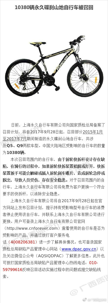 : 日前,因自行车前轮快拆杆设计存在缺陷,存在安全隐患。上海永久自行车有限公司将自2017年9月28日起,召回部分2015年1月至2017年7月期间制造的永久碟刹山地自行车,共涉及Q5、Q9两款车型。中国大陆地区受影响的自行 ...